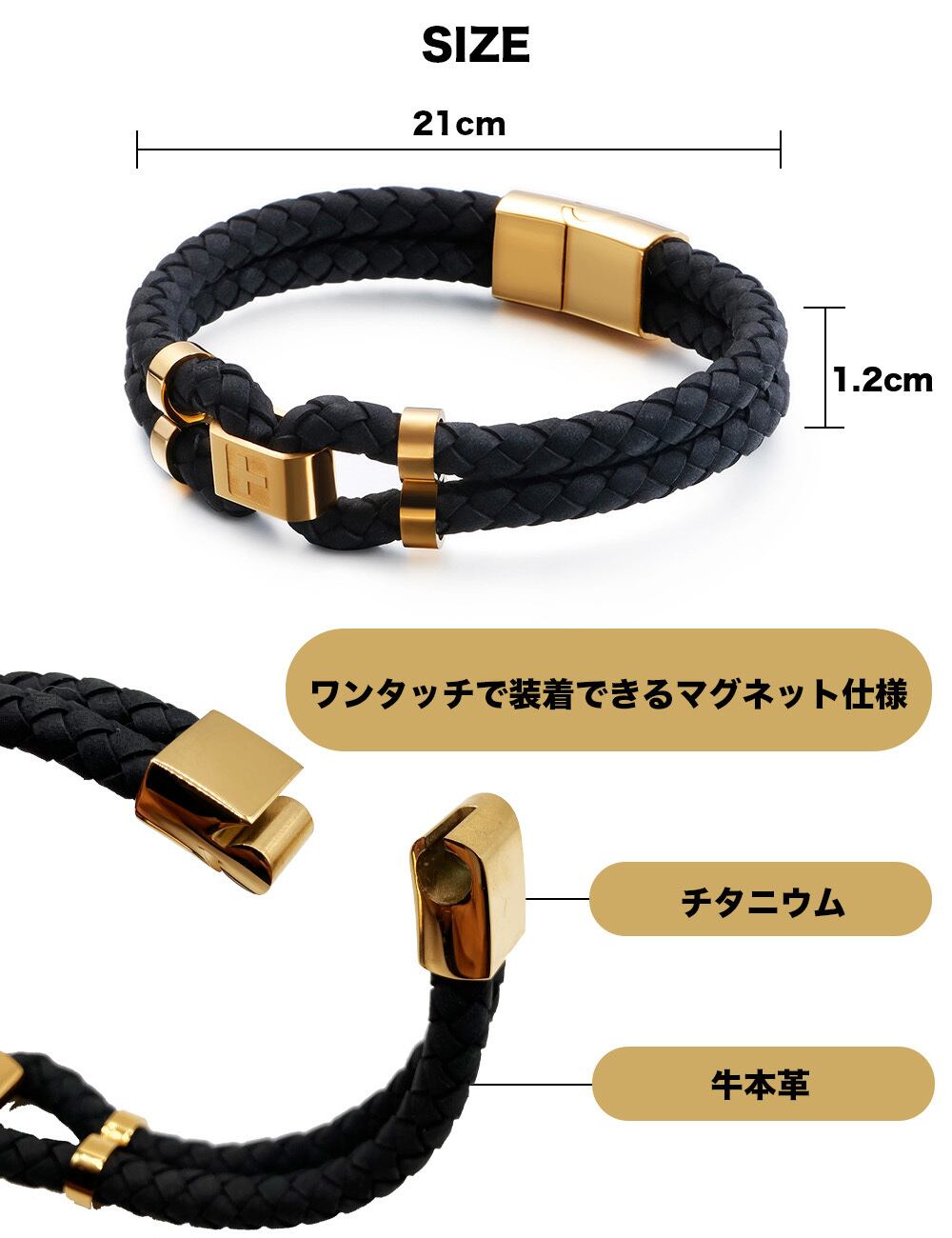 【デザイン】マットな質感のブラック編み込みレザーに、ゴールドカラーのメタルパーツが映えるメンズブレスレット。