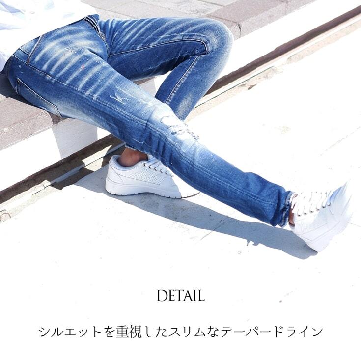 インディゴブルーを基調としたメンズ定番ジーンズにトレンド感あるペイント加工をプラスしたデニムパンツ。圧倒的なカッコよさを追求し、ダメージジーンズならではの程良いクラッシュ感ワンランク上のストレートデニム。